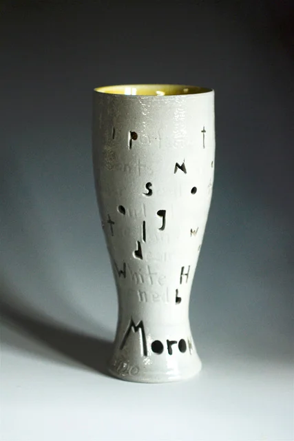 I first saw a Morley pierced double-walled stoneware mug in the Delhom Collection at the Mint Museum almost three decades ago. It struck me then and has stuck with me ever since. First, I love this basic cup form: a cylinder atop a globe, wedded with a handle. I’ve seen variations of this iconic form in pre-modern European, Native American, and Islamic ceramics. But there is an extravagance to the pierced double-walled version; the visual and technical complexity of this usually humble pot is undeniable. For a potter to throw two independent and joined walls is a lot of extra work—and yet offers less volume for the drinker. So why the double wall? The handle takes care of any concern that a hot beverage could transfer heat from the inner wall, making the pot uncomfortable and necessitating the second skin. But there is something immensely pleasing about the way the inner container hangs down from the rim of the outer form, suspended but not touching the foot ring. And the double wall makes possible the strangely stylized foliate piercings, a visual play on our expectation of a container’s integrity: this mug has holes and yet is not leaky. The iconography of the Delhom mug’s time-consuming piercings are quirky, somewhere between star and fossil, the curvilinear incised stems mannered.